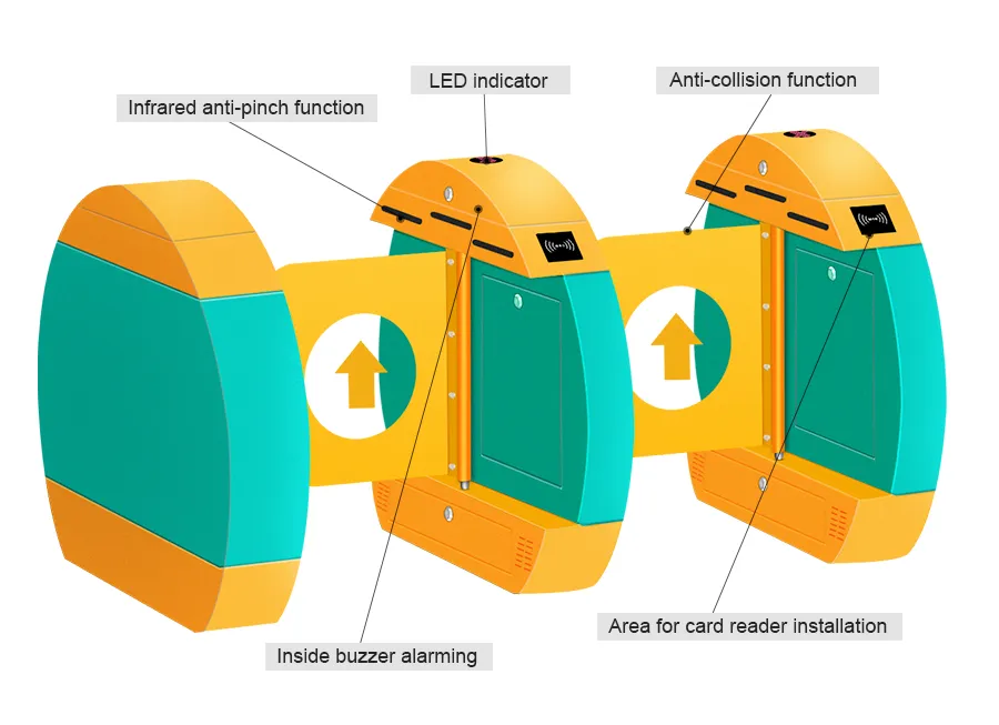 7, The swing barrier gate system is compatible with a variety of readers, such as fingerprint, RFID, and facial recognition scanners. When a fire alarm or blackout is detected, the gate barrier will automatically open because the motherbroad of the device contains a fire protection port that can receive signals from the fire protection equipment.